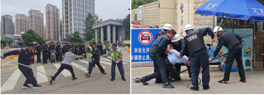 查验工作结束后,保卫处领导、教师代表、学生代表分别在两校区与保安队员们共同开展了一次反恐应急处突演练。