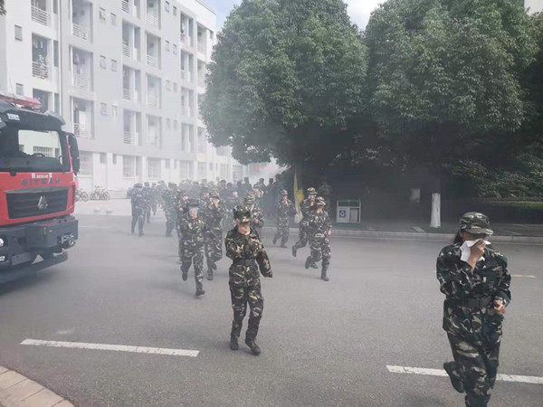 警报器发出刺耳声响,应急逃生疏散演练开始,3000余名参训师生按照引导员的指令,纷纷捂住口鼻,弯腰贴墙,有序、快速从安全出口逃离,远离烟雾,安全疏散至一期篮球场。