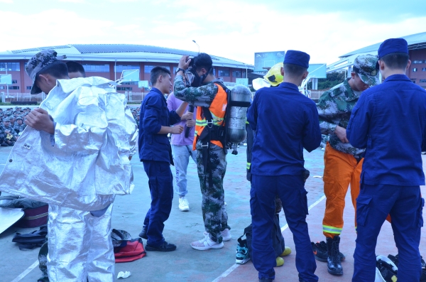 15:00演练正式开始,防火预警报响彻整个校区,2800余名新生在引导员的引导下分别从一期二期宿舍,按要领快速穿过模拟烟雾场地并有序撤离到指定集合点。昆明应急救援呈贡区大队消防宣讲员唐老师,为同学讲解了灭火器的使用方法并让学生代表体验如何使用灭火器,讲解了消防基本知识和预防消防等意外的应急逃生自救基本技能。大队官兵们还展示了各类消防器材装备并与同学进行互动交流,进一步提升了同学们对消防器材、装备的认知。