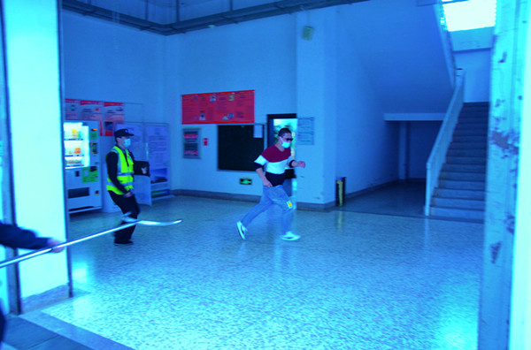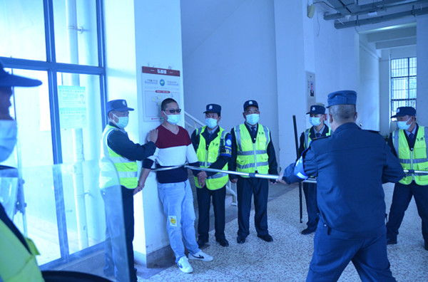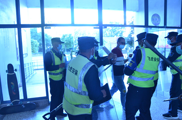 9:00许,一名疑似“不法份子”,手持凶器由东门南侧小花园闯入弘毅楼,值班保安立即向队长边报告边手持防暴器械进行阻拦,与现场巡逻队员共同围堵“不法份子”。同时启动校园反恐防暴应急预案。