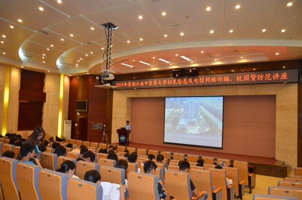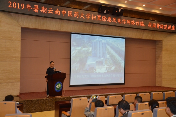 呈贡区扫黑办张仕林警官在翰墨楼一楼报告厅为师生进行深入细致的“扫黑除恶及电信网络诈骗、校园贷防范”等知识的讲解。