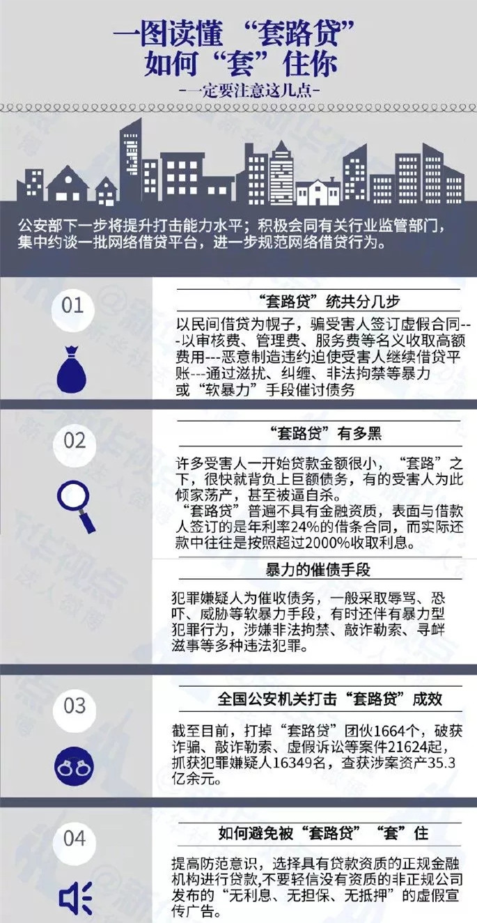 下一步,全国公安机关将深入贯彻以习近平同志为核心的党中央决策部署,按照中央政法工作会议精神和全国扫黑除恶专项斗争领导小组会议要求,坚持以人民为中心,将严厉打击“套路贷”类违法犯罪活动作为深化扫黑除恶专项斗争的具体举措,充分运用大数据、信息化手段,提高分析研判和发现预警能力,不断提升打击能力水平,并积极会同有关行业监管部门,集中约谈一批网络借贷平台,进一步规范网络借贷行为,切实维护人民群众生命财产安全和社会治安大局稳定。